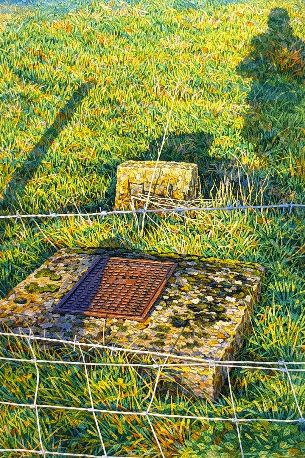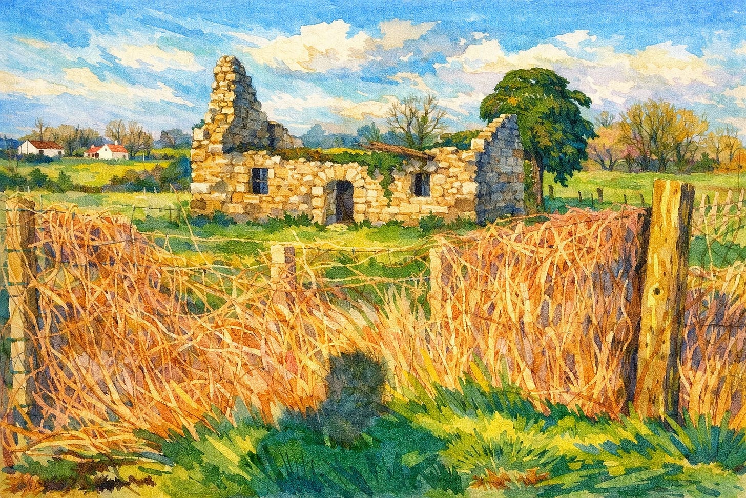 Beyond the cow-gate and the hydrant in the mid-distance is a crumbling stone cottage of ancient times past. The gable ends, four walls and windowless windows are still visible and stubbornly refuse to yield to the passage of time. An evergreen tree grows out of the side of one of the walls. The roof is missing but there will be no rain tonight only bright stars in the sky.