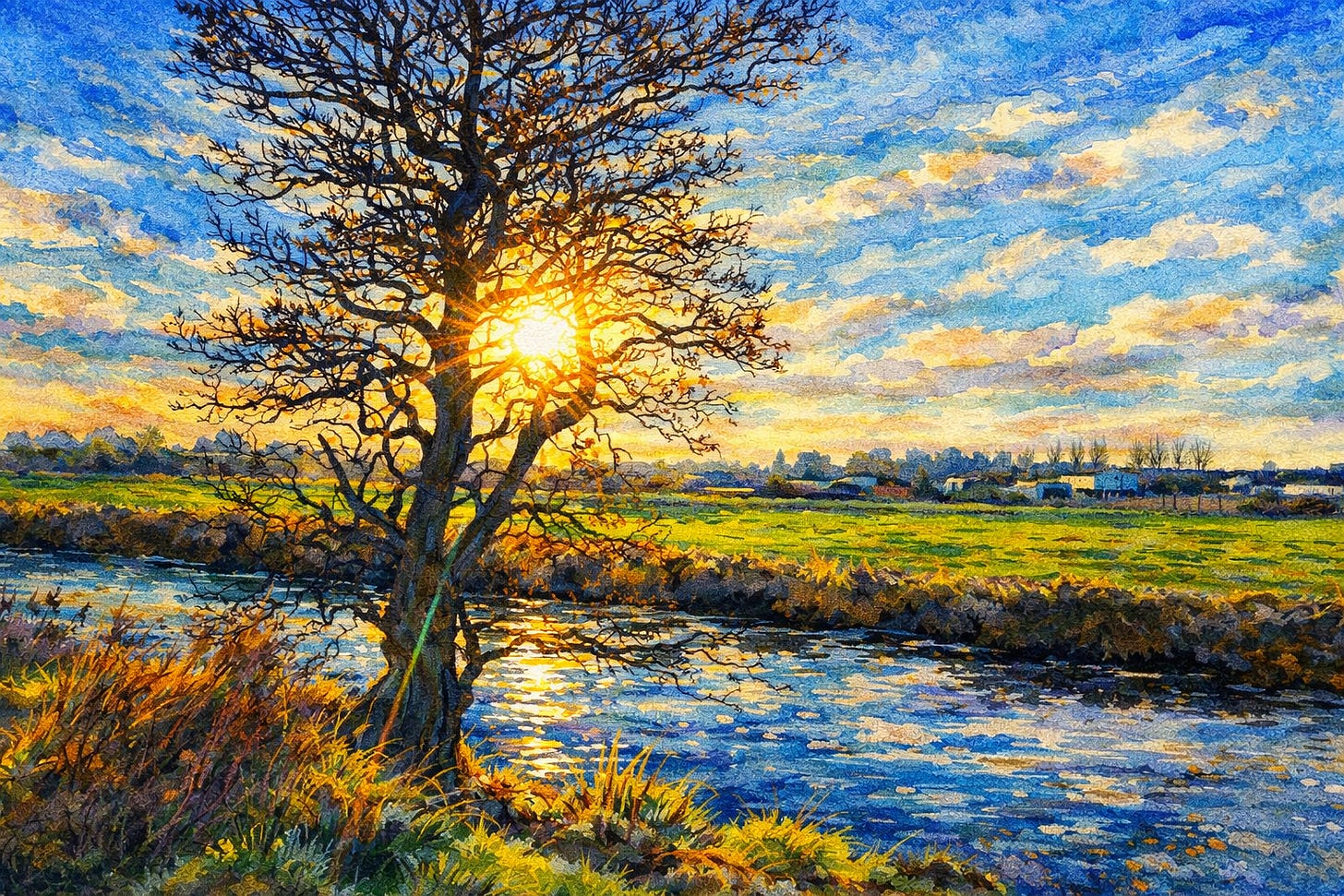 In the distance a bare green field and some trees lock lips with the pale-blue, cloud spotted heavens. Soon, the sun beams through the branches of a leafless tree and in so doing shards into a thousand streaks of divine brilliance. Sunlight sparkles across the river’s ripples and bounces off the stiff blades of grass. The elements working as one to effortlessly move into place and clear a celestial path.